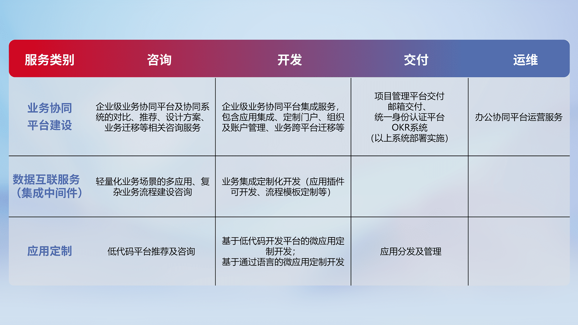 针对钉钉、、、企微、、、、IDaas等平台级产品提供产品的规划、、、、方案、、、交付、、定制化开发等服务,,,实现如统一协同办公、、智能客户服务、、混合会议管理、、、智能数据查询、、、等业务场景,,,实现数字化转型。。。